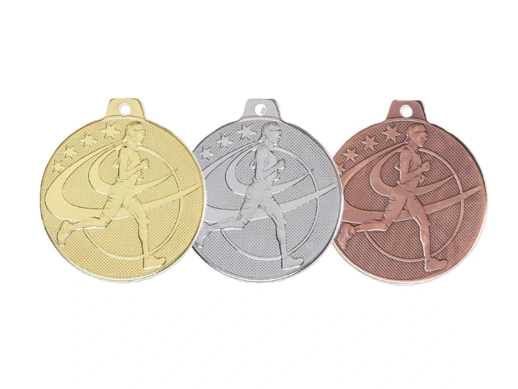 Kovová medaile s motívem běhu ve zlatém, stříbrném nebo bronzovém provedení s možností zavěšení na stuhu (dle vlastního výběru). Na zadní stranu medaile je možnost umístění grafiky/textu (průměr 50mm).