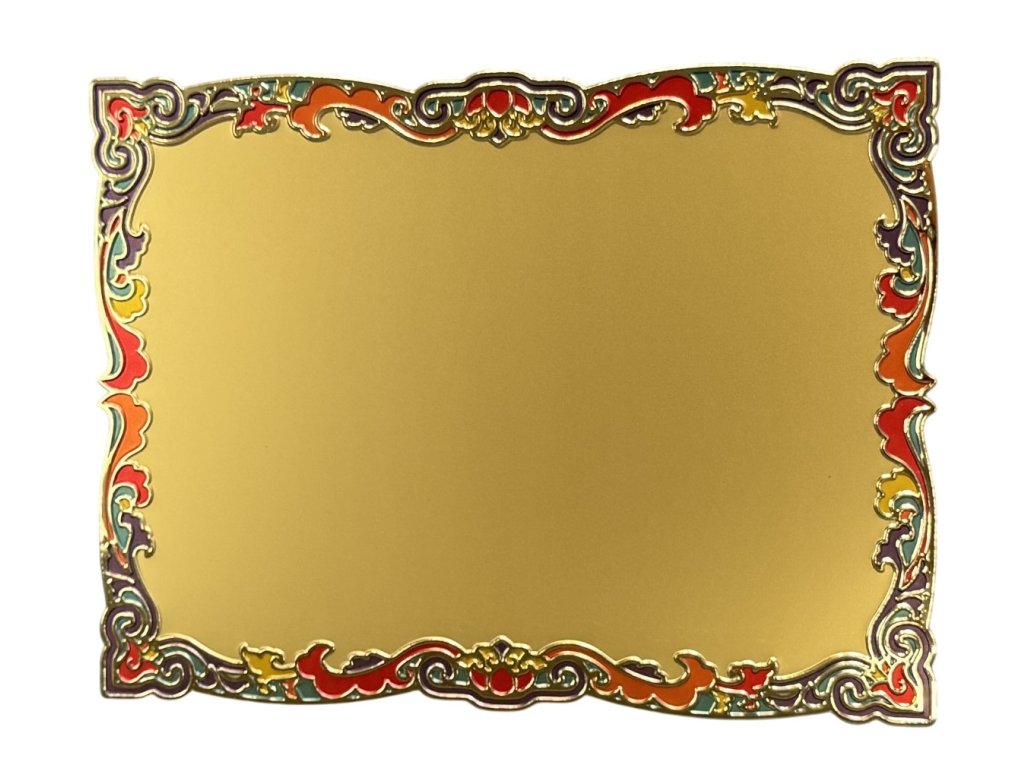 Dekorativní plaketa je určena pro sublimaci (s orientací na výšku nebo i šířku), je vyrobena z ozdobného plechu ve zlatém odlesku s barevným květinovým detailem po kraji. Design plakety je ideální volbou pro různé druhy společenských událostí, speciální sportovní akce a pod.