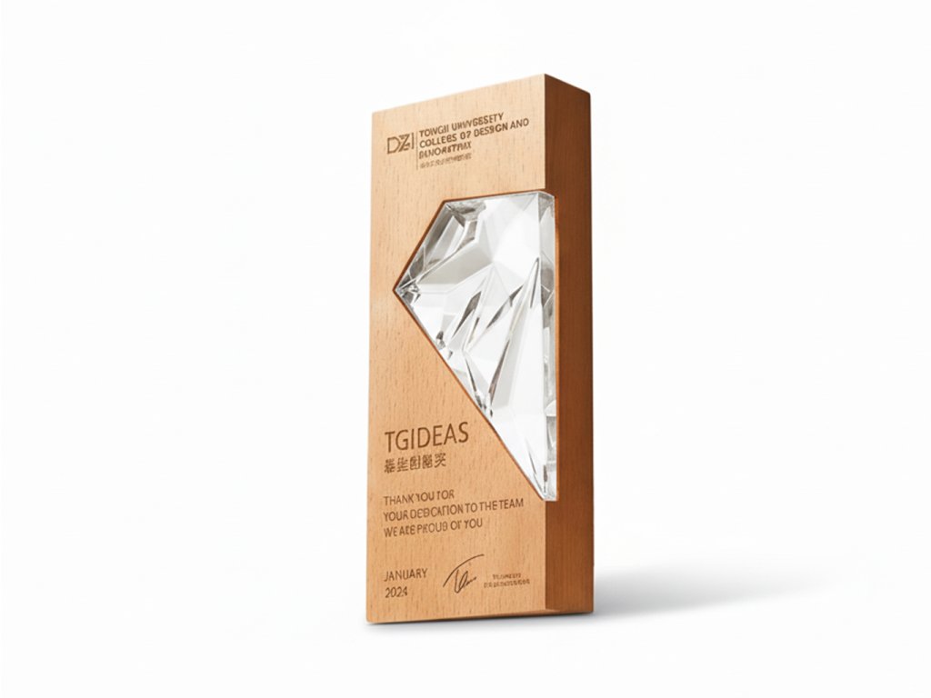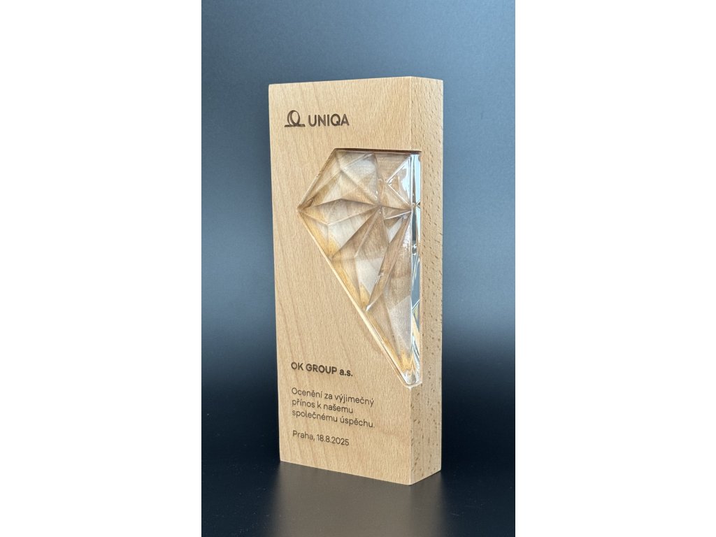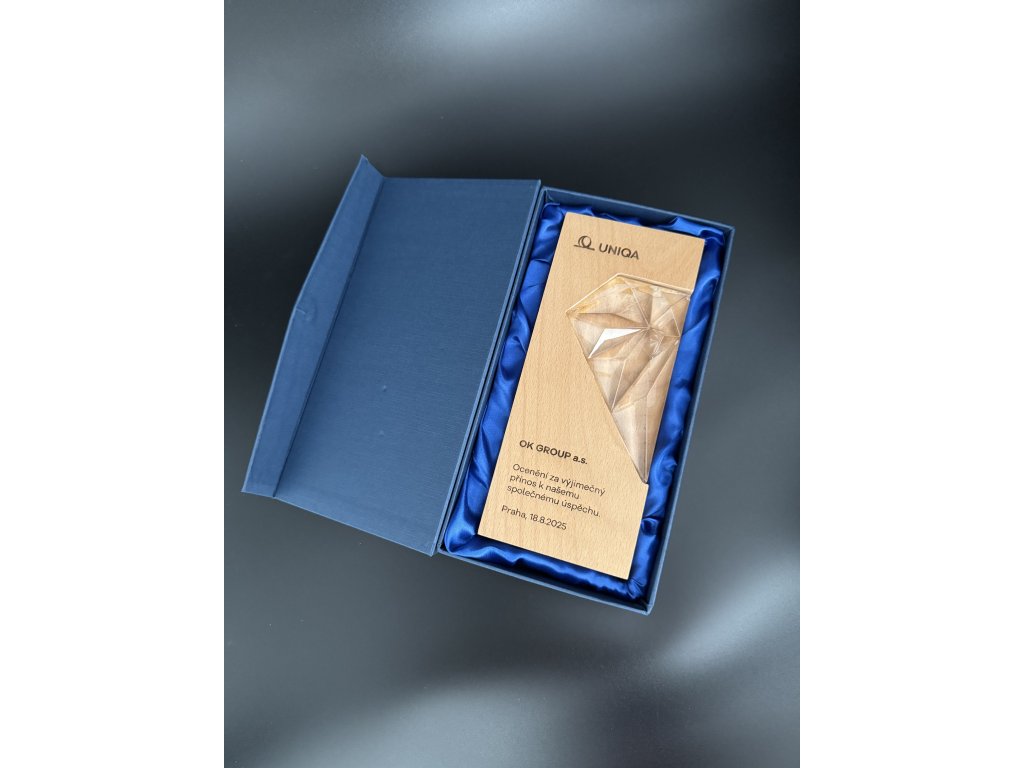 Stylová plaketa v kombinaci sklo/dřevo, s možností gravírování na dřevo. Dizajn skla je ideální volbou pro různé druhy společenských událostí, speciální sportovní akce a pod.