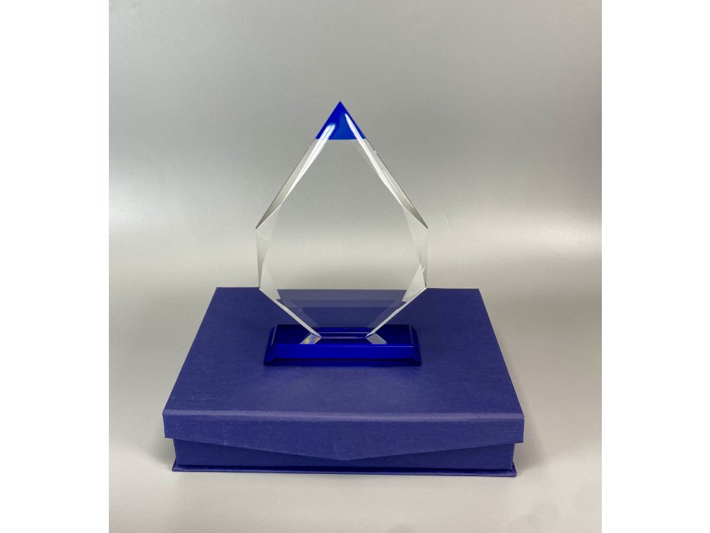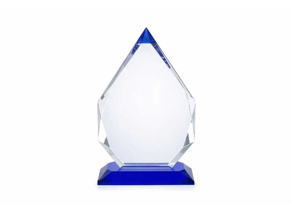 Elegantní sklo s modrým podstavcem, s možností gravírování na sklo. Design skla je ideální volbou pro různé druhy společenských událostí, speciální sportovní akce a pod.