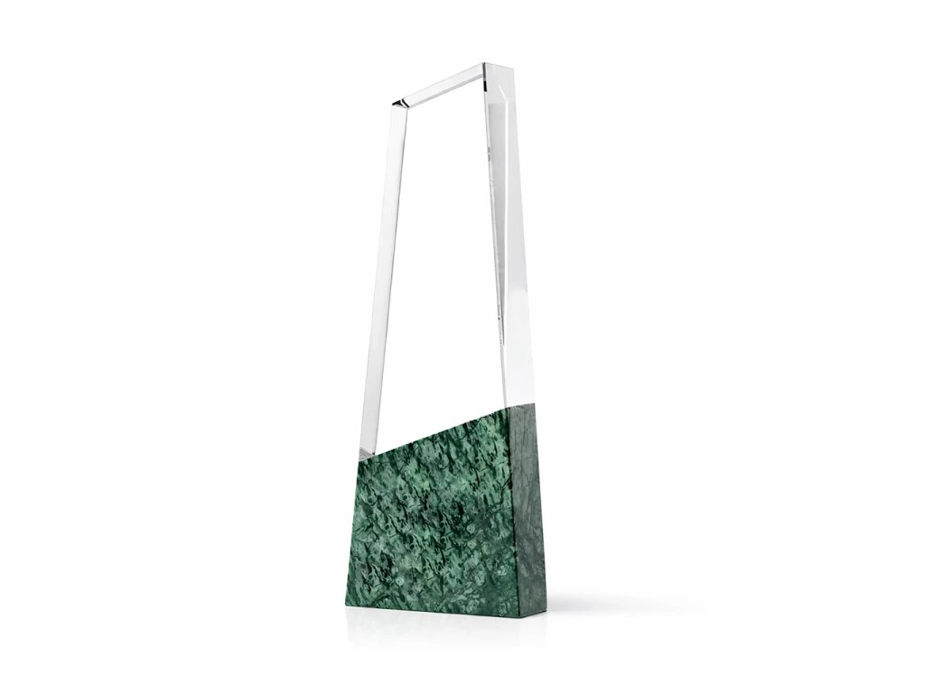 Stylová skleněná trofej se zkosenou vrchní hranou působí velmi elegantně na černém skleněném podstavci, s možností gravírování na sklo. Design skla je ideální volbou pro různé druhy společenských událostí, speciální sportovní akce a pod.