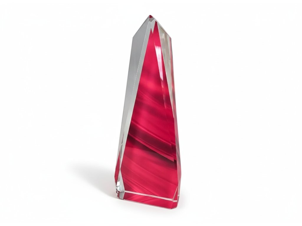 Moderní skleněná trofej s červeným abstraktním pozadím, s možností gravírování na sklo. Design skla je ideální volbou pro různé druhy společenských událostí, speciální sportovní akce a pod.