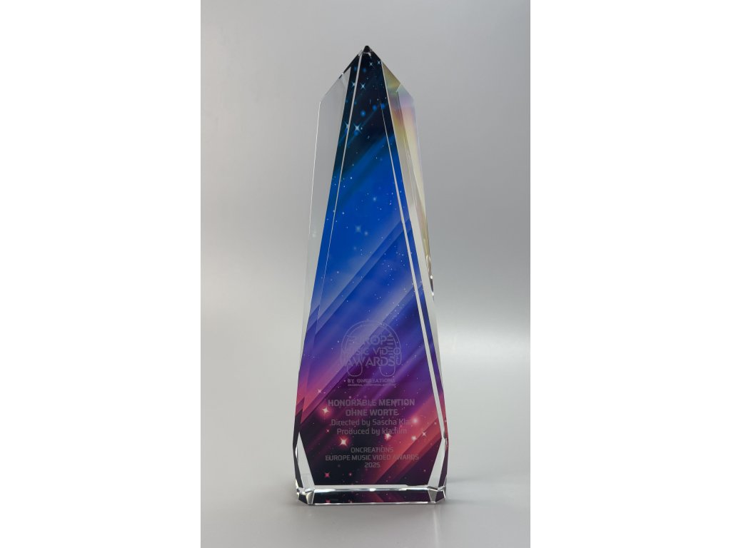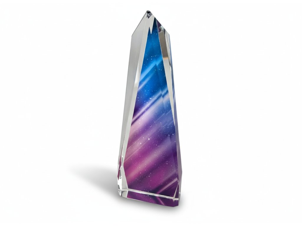 Moderní skleněná trofej s modro-fialovým abstraktním pozadím, s možností gravírování na sklo. Design skla je ideální volbou pro různé druhy společenských událostí, speciální sportovní akce a pod.