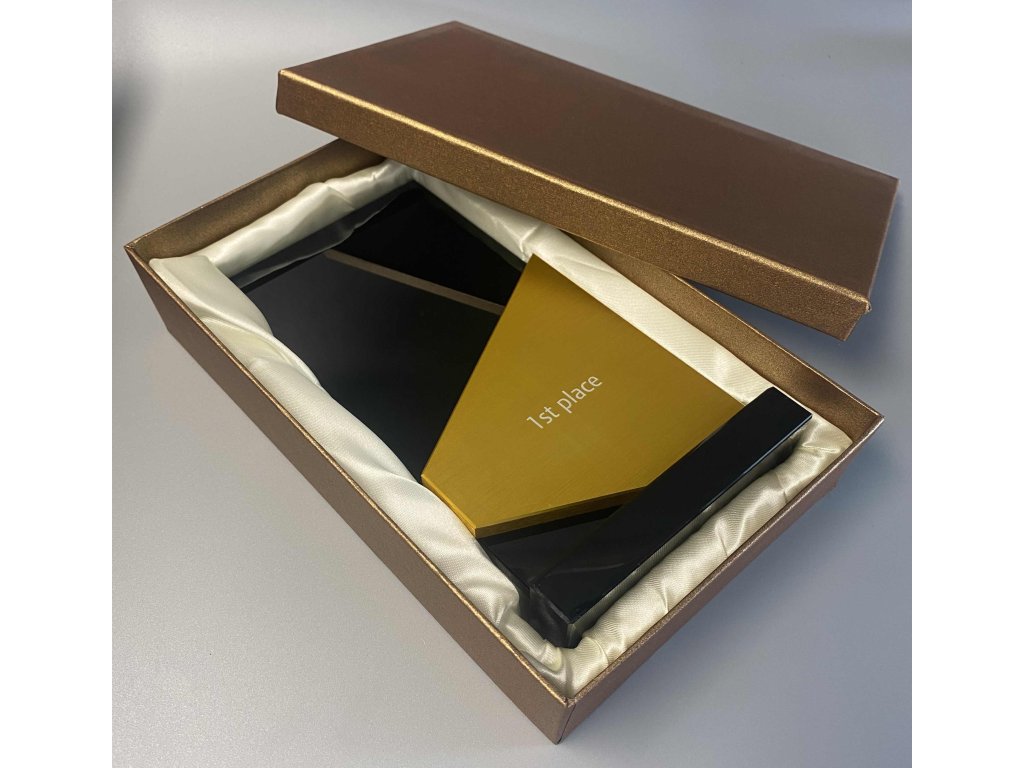 Stylová skleněná trofej v kombinaci se stříbrném kovovým doplňkem, s možností gravírování na sklo i na kov. Design skla je ideální volbou pro různé druhy společenských událostí, speciální sportovní akce a pod.