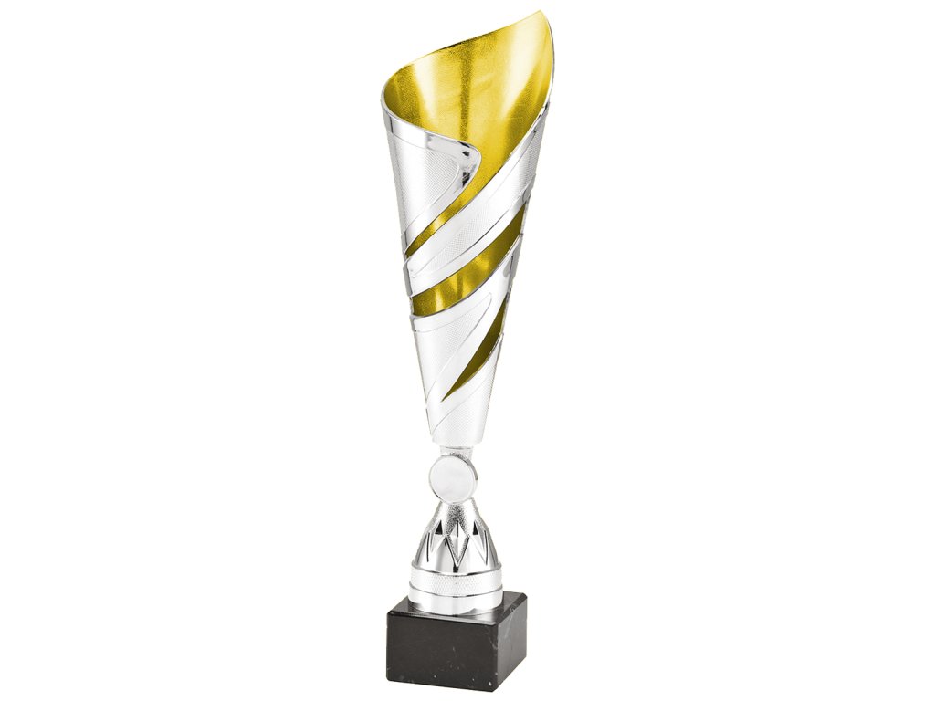 Stylový pohár s unikátním tvarem ve stříbrným provedení se zlatým detailem v kalichu na mramorovém podstavci. Trofej lze doplnit o emblém (25mm) + gravírovaný štítek umístěný na podstavci. Pro odstupňování pořadí oceněných jsou dostupné 3 varianty.