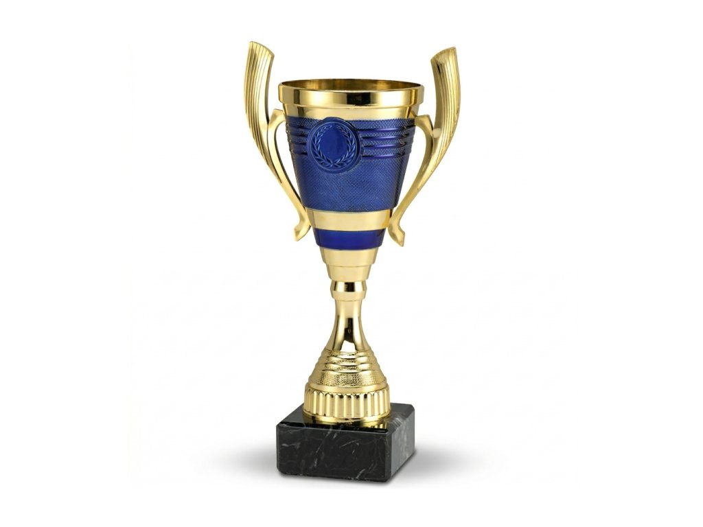 Jedinečný pohár s oušky ve zlato - modrém provedení na černém podstavci. Trofej lze doplnit o emblém - průměr 25mm (není v ceně) a gravírovaný štítek, který je umístěn na podstavci. Pro odstupňování pořadí oceněných jsou dostupné 3 barevné varianty.