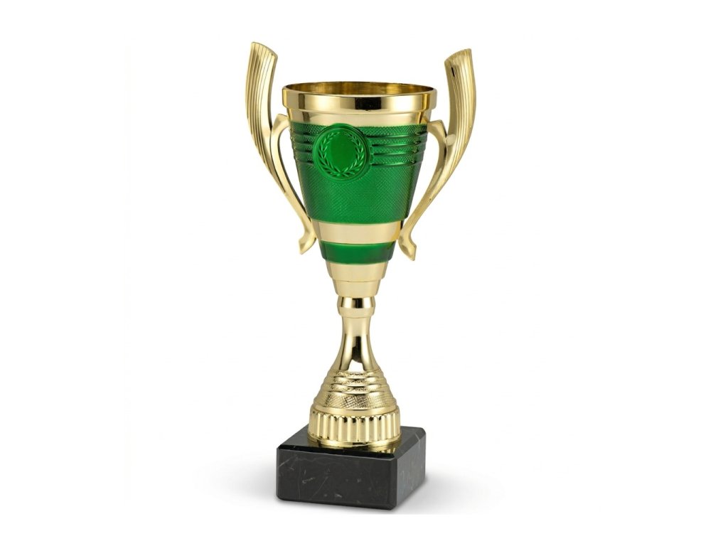 Jedinečný pohár s oušky ve zlato-zeleném provedení na černém podstavci. Trofej lze doplnit o emblém - průměr 25mm (není v ceně) a gravírovaný štítek, který je umístěn na podstavci. Pro odstupňování pořadí oceněných jsou dostupné 3 barevné varianty.