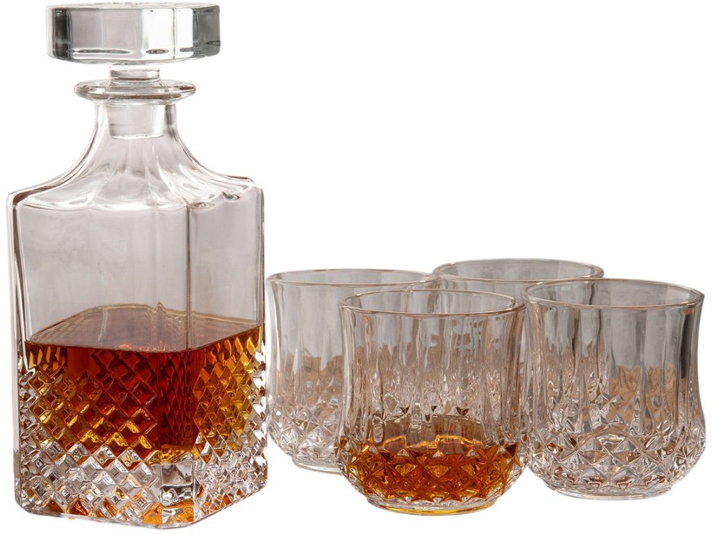 Tato stylová souprava obsahuje skleněnou láhev na whisky a čtyři skleničky, které budou ideálním dárkem pro milovníky kvalitního alkoholu. Vyniká čistým designem, precizním zpracováním a možností gravírování jména, loga nebo věnování dle přání POUZE NA LÁHEV.