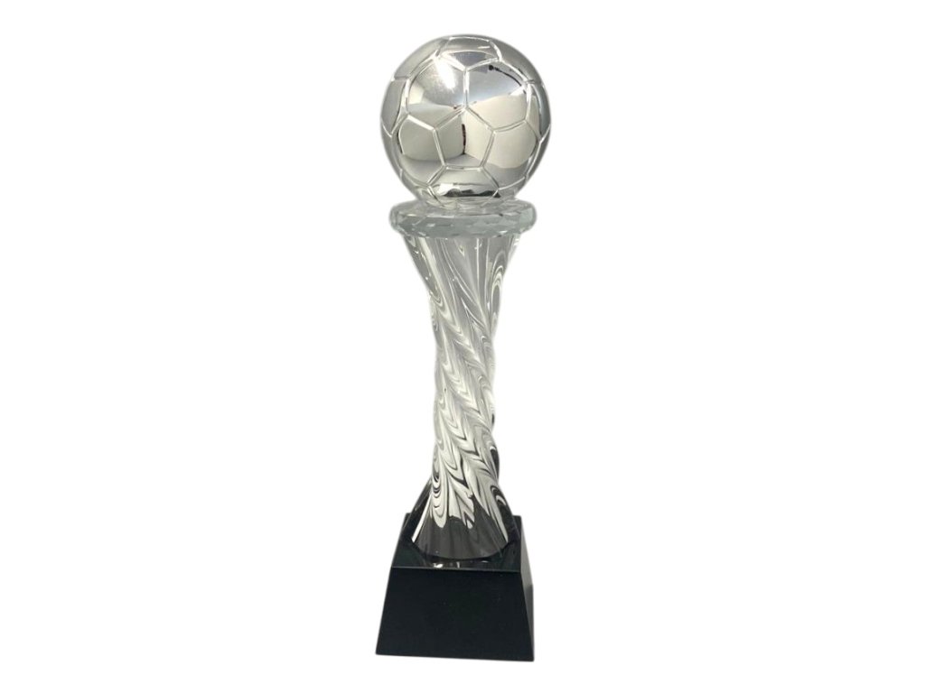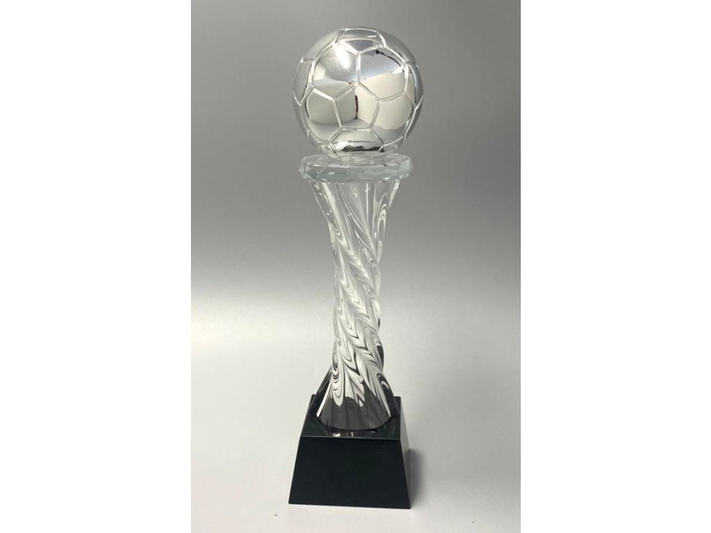 Stylová skleněná trofej působí velmi luxusně, se stříbrným fotbalovým míčem, s možností gravírování na podstavec. Design skla je ideální volbou pro různé druhy společenských událostí, speciální sportovní akce a zvlášř pro nejlepší fotbalisty.