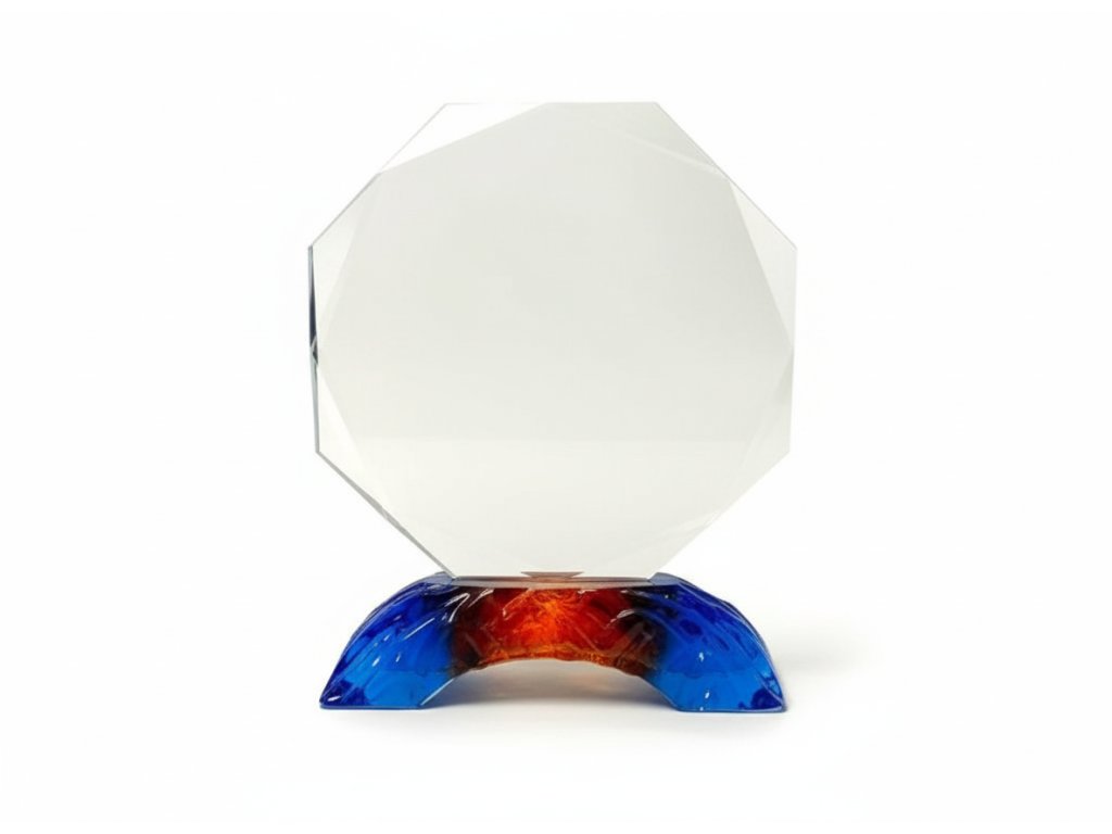 Stylová skleněná trofej působí velmi elegantně se vícebarevným podstavcem, s možností gravírování na sklo. Design skla je ideální volbou pro různé druhy společenských událostí, speciální sportovní akce a pod.